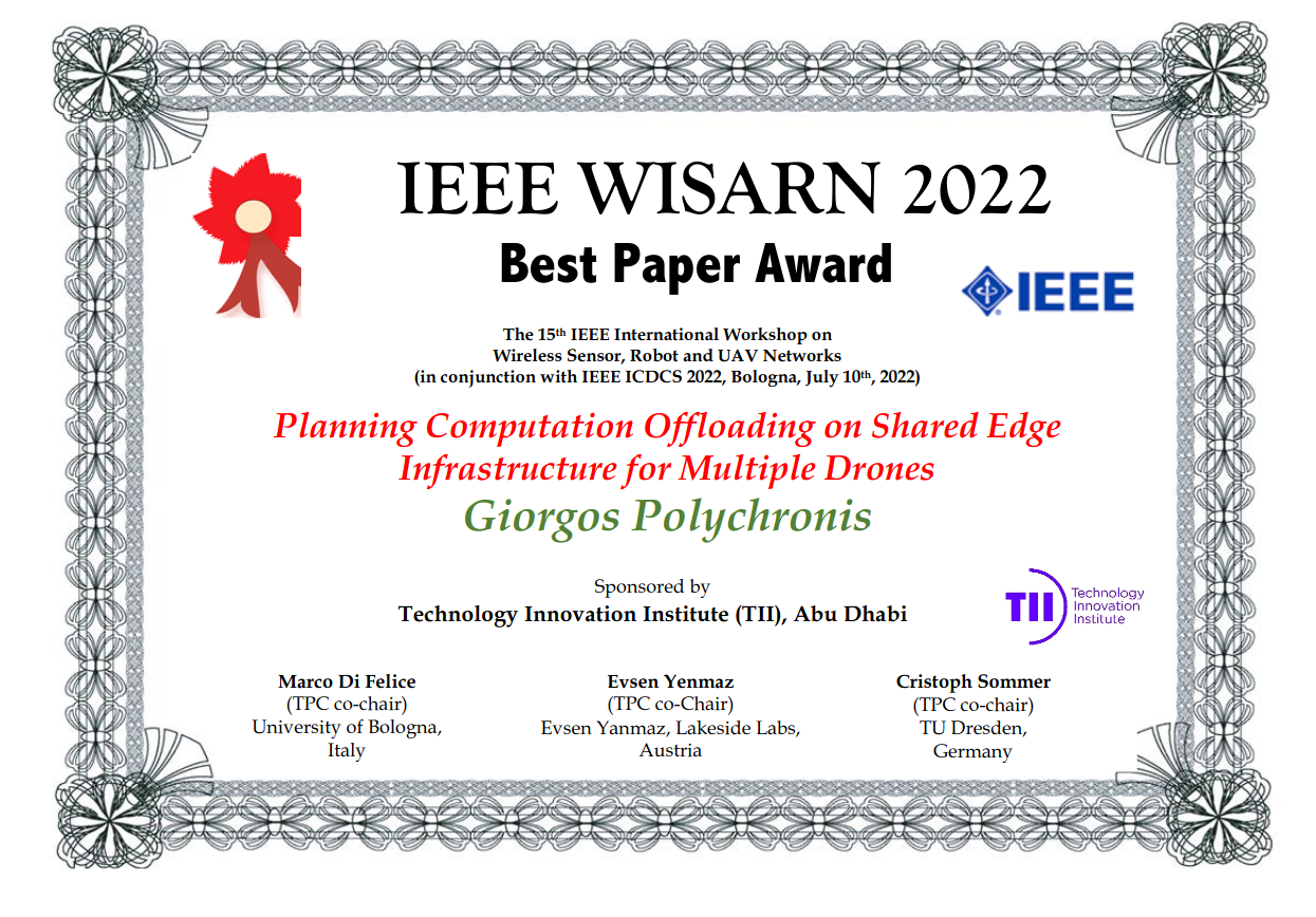 The paper on “Planning Computation Offloading on Shared Edge Infrastructure for Multiple Drones” received the Best Paper Award at the 15th I...
